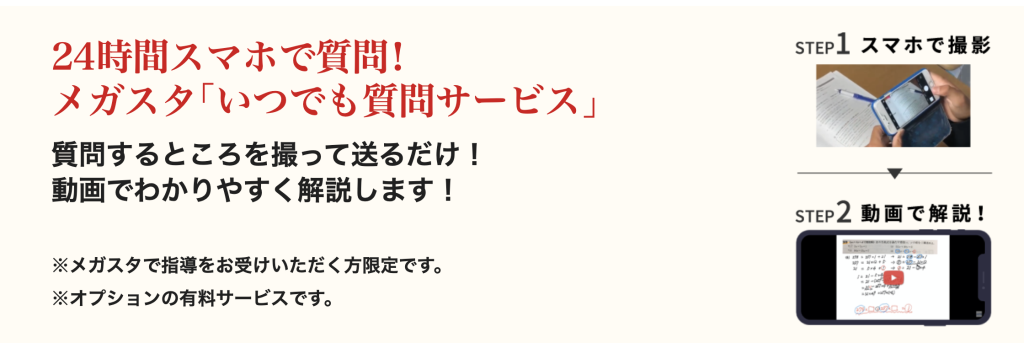 もしくは、LINEでいつでも質問ができるオンライン塾を選ぶのも手です、たとえば、メガスタなら、LINEでわからない問題の写真を撮って送ると、講師の方が回答動画を撮影して返信してくれます。